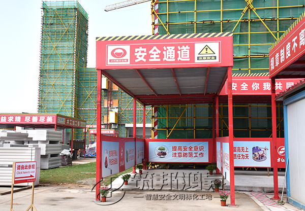安全通道,施工現(xiàn)場實行人車分流,主要人員出入通道搭設了專用安全通道,安全通道兩側(cè)設置宣傳欄,提升施工作業(yè)人員的質(zhì)量意識、安全意識。