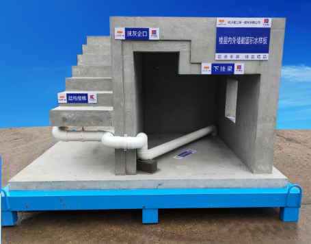 工藝展示:結(jié)構(gòu)樓梯混凝土成型,抹灰企口,下掛梁,窗臺(tái)企口,外墻積水槽,射釘固定,積水收集口,排水管道安裝固定等工藝。
